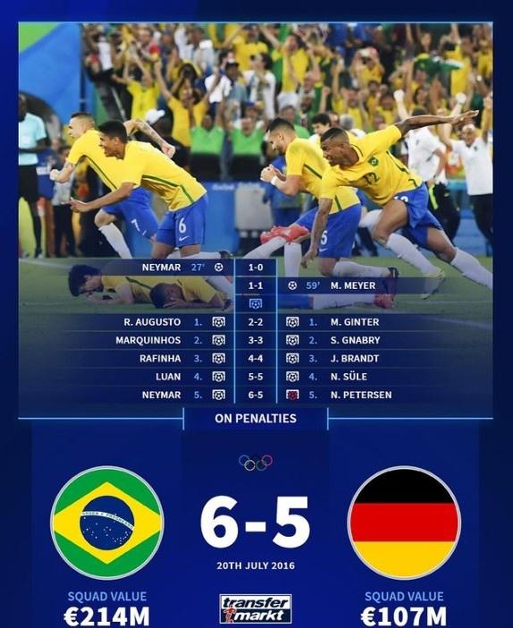 2016年里约奥运会:内马尔第26分钟首开记录,梅耶第59分扳平比分。点球大战第5罚,彼得斯射失点球,内马尔一击制胜,巴西6-5德国