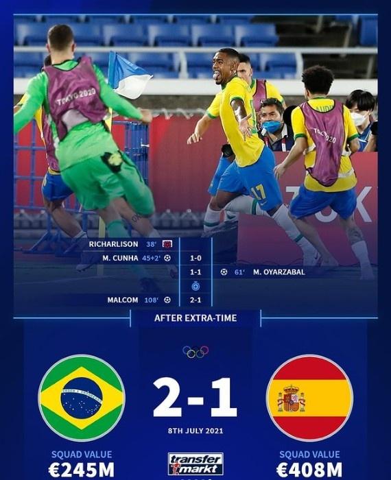 2020东京奥运会:理查利森失点,库尼亚上半场补时破门,奥亚萨瓦尔第61分钟扳平比分。马尔科姆加时赛打进制胜球,巴西2-1西班牙