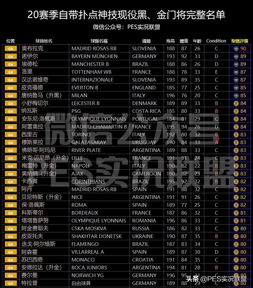 20赛季自带扑点技能的守门员有哪些呢?见下图: