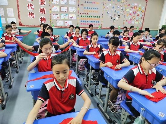 红领巾是是红旗的一角,是革命烈士们用鲜血染红的,庄严不容侵犯。仪式上,每一位队员庄严地取下红领巾,并将它折叠整齐,摆放在课桌上。队员们郑重地为小伙伴戴上了闪亮的队徽,并相互敬队礼。