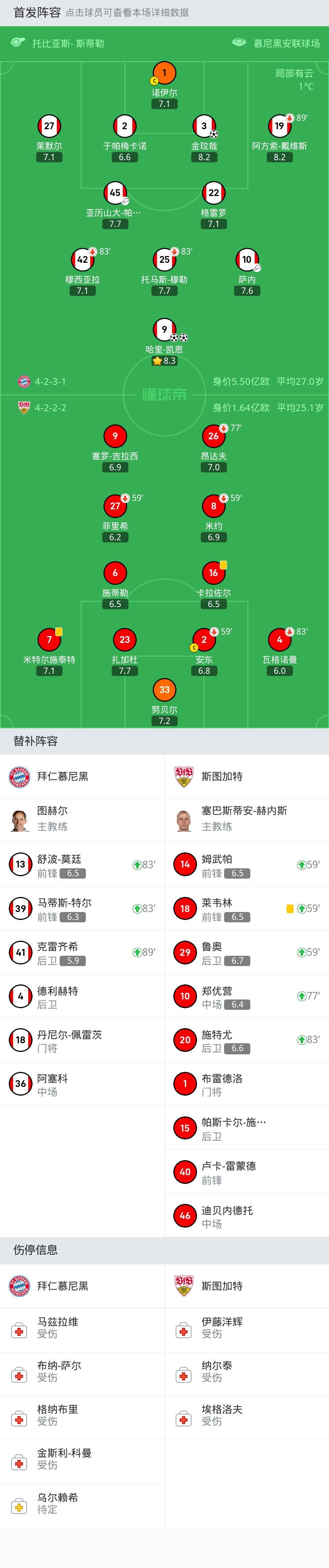 替换下场:17分钟22-格雷罗, 64分钟7-格纳布里, 46分钟15-戴尔, 64分钟6-基米希, 72分钟39-马蒂斯-特尔