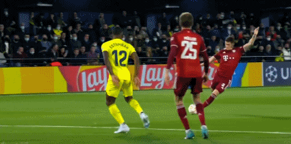2021-2022欧冠联赛12日进行的四分之一决赛中,比利亚雷亚尔客场1:1逼平拜仁慕尼黑,两回合总比分2:1淘汰德甲“领头羊”,时隔16年再次闯入欧冠半决赛。双方首回合较量时,有着“黄色潜水艇”之称的西甲球队比利亚雷亚尔主场1:0战胜拜仁。12日次回合交锋中,上半场双方互交白卷。第52分钟时,客队后场出球失误,拜仁断球反击,莱万多夫斯基在禁区前弧顶处接穆勒直传射门,球击中立柱弹入门内,拜仁1:0领先。