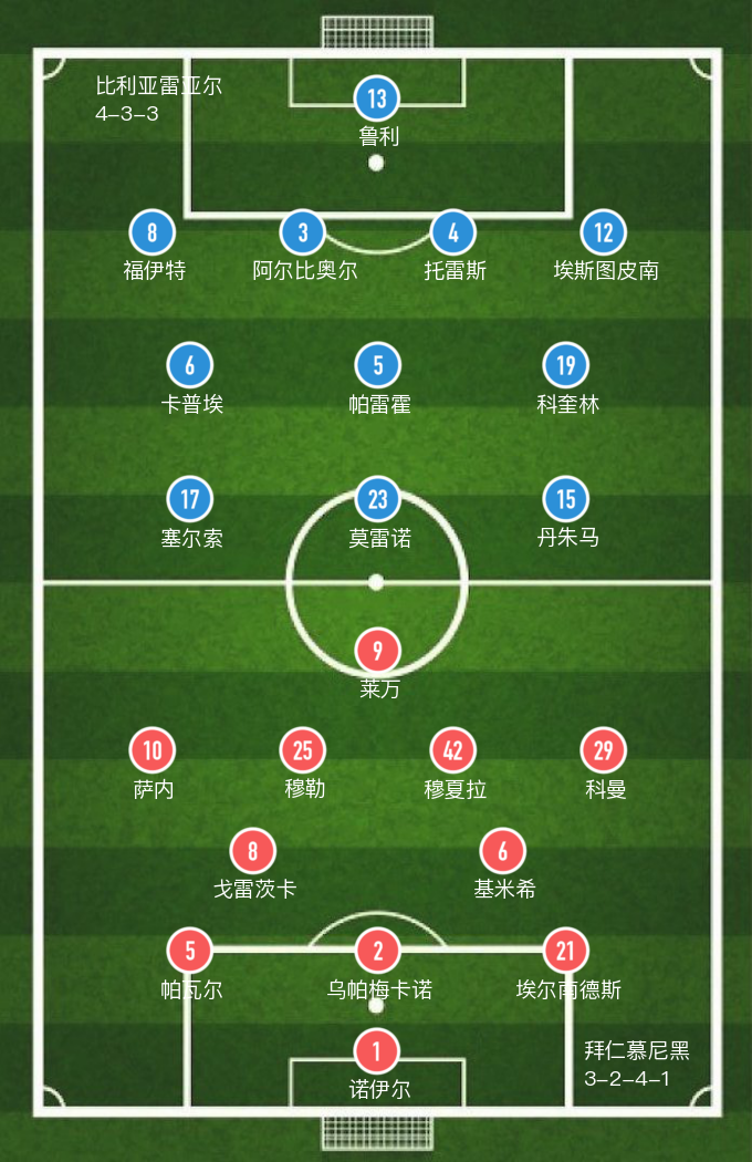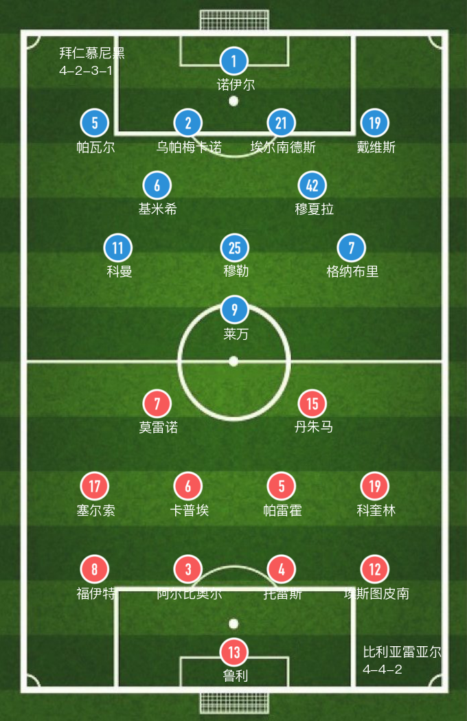 拜仁慕尼黑(4-2-3-1): 1-诺伊尔,5-帕瓦尔(71' 4-聚勒),2-乌帕梅卡诺,21-埃尔南德斯,19-戴维斯,6-基米希,42-穆夏拉,11-科曼,25-穆勒(62' 8-戈雷茨卡),7-格纳布里(62' 10-萨内),9-莱万