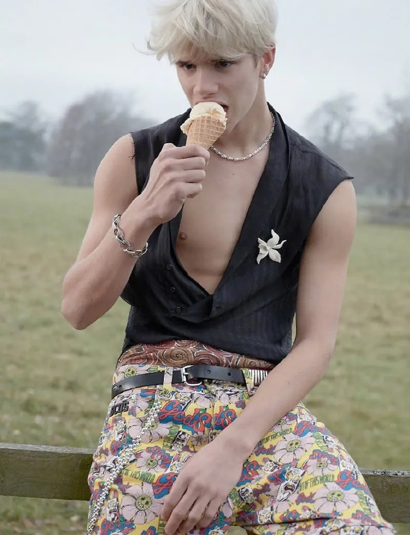 俏皮中带有一丝不羁,黑色深V上衣搭配印花裤子,男孩的天真与叛逆都展现得淋漓尽致。