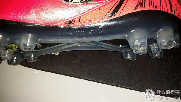 这款尼龙复合TPU的AG大底已经在耐克足球鞋上广泛使用,具有耐磨、缓震、回弹强劲等优点,在此不再赘述。外观方面,次顶级款没有在底部加入“野兽之腹”花纹,鞋钉也非全部透明,中间部分是半透明。