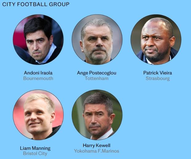 热刺主教练波斯特科格鲁曾在横滨水手队执教时为城市足球集团工作。现任伯恩茅斯主教练安多尼-伊拉奥拉曾在纽约城足球俱乐部效力。维埃拉在执教尼斯、水晶宫和斯特拉斯堡之前,曾在曼城和纽约城工作。