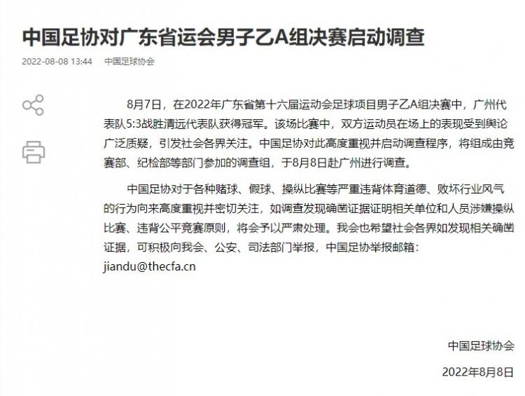 直播吧8月8日讯 广东省运会决赛深陷假球风波,登上微博热搜,足协官方回应表示已启动调查程序,将组成由竞赛部、纪检部等部门参加的调查组,今日赴广州进行调查。