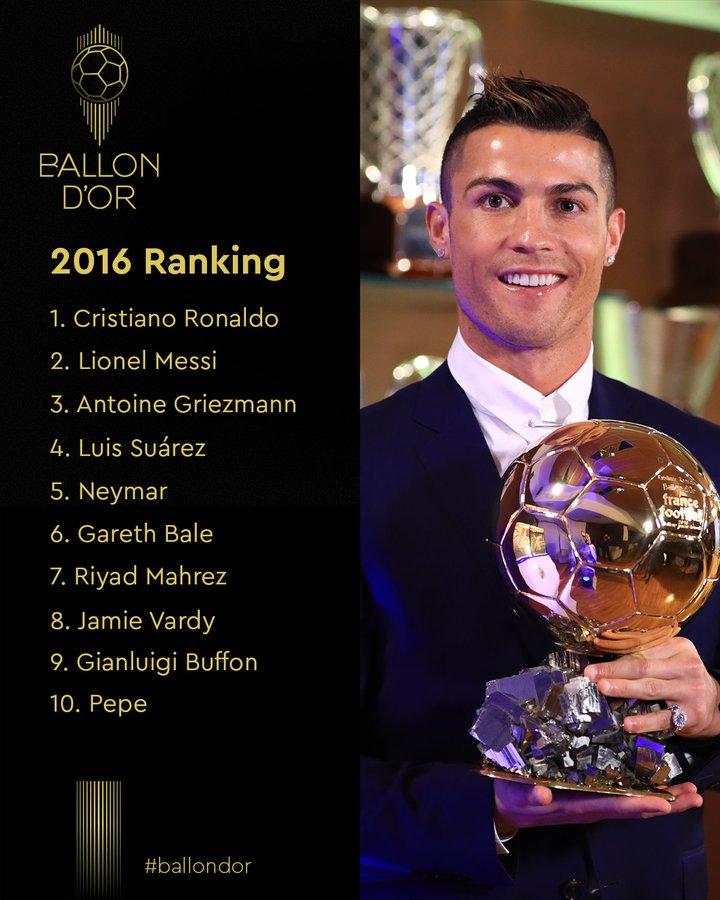 直播吧10月12日讯 随着2022年金球奖颁奖典礼的邻近,《法国足球》杂志回顾了2016年的金球奖排名情况。C罗在那年获得了金球奖,这是他个人的第四座金球奖奖杯,梅西第二,格里兹曼排在第三。