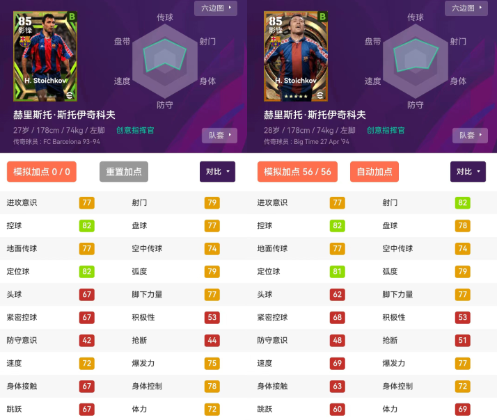 他俩一般B状态下,多项数据也拉满了,对比还是很明显的。斯托伊奇科夫的射门精度和力度的都能拉满,所以打影锋和拉边都可以。
