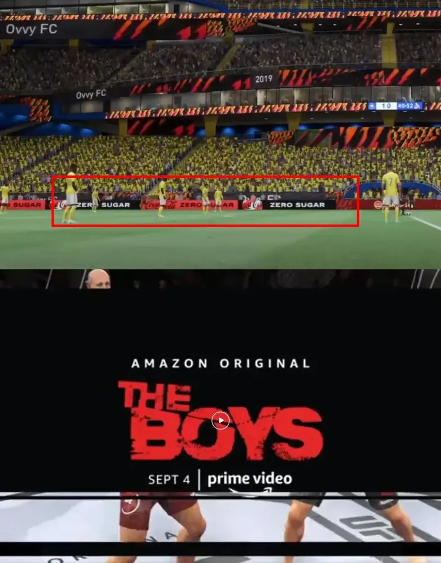 游戏中的场边广告虽然和现实中长得一样,但商业价值却不是一个量级。就算抛开在线游玩人数和比赛观看人数巨大差异不谈,游戏里广告牌面对的是全神贯注操控的玩家,给到场边的镜头并不多;球赛的受众则是注意力没那么集中的看客,还有不少非全景的特写镜头,最重要的是,后者的广告效果已无需再作证明。