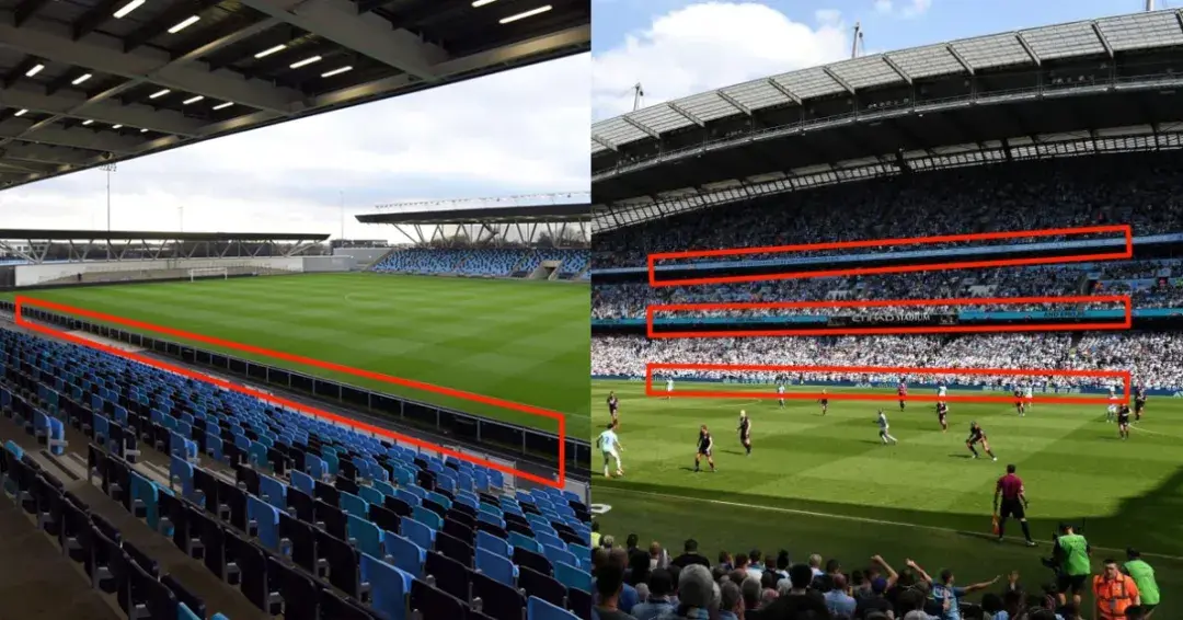 又比如英超联赛中的顶级球队,曼彻斯特城男队和女队的主场分别是曼彻斯特市球场和曼城学院体育场,前者能同时容纳约53400名观众,有上下四排场边广告位;后者只有7000个观众席,和一圈广告牌。
