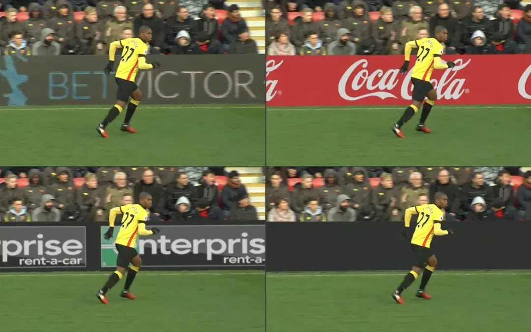 去年欧洲杯期间热搜的“中文广告牌造假”事件中,焦点正是这项技术。因为场边有太多中文广告,有人发文称这是使用了虚拟广告牌的地区特供广告,之后获得澄清并不是。