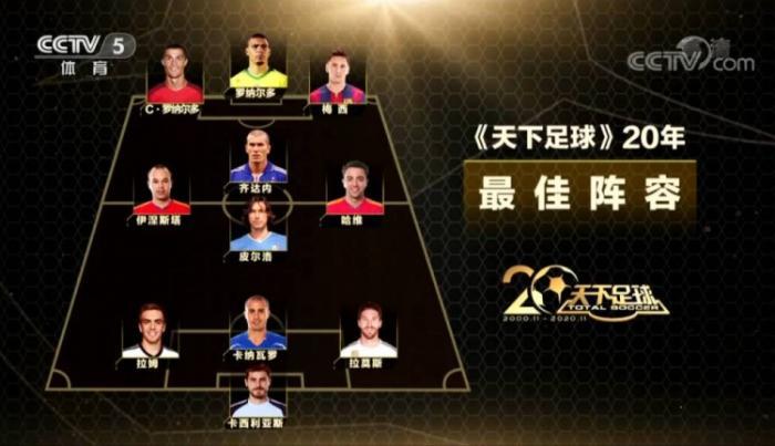 中新网11月17日消息,在这个11月迎来首播二十周年纪念的央视《天下足球》栏目,在16日的特别节目中评选出了一套过去二十年的“最佳阵容”。阵型采用3-4-3,卡西、拉姆、卡纳瓦罗、拉莫斯、伊涅斯塔、皮尔洛、齐达内、哈维、C罗、大罗、梅西入选。