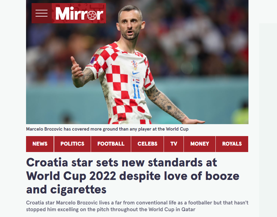 他就是克罗地亚中场大将布罗佐维奇。英国《每日镜报》撰文指出,30岁的布罗佐维奇是另类:他爱好抽烟喝酒,但世界杯赛场上,他创造了新纪录。