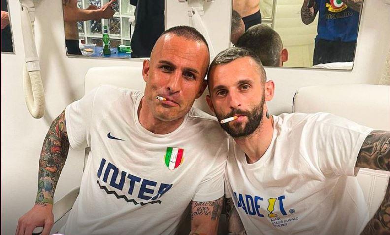 今年5月的意大利杯,国米击败尤文夺冠。布罗佐维奇在更衣室抽烟,还发布在社交平台上。前国米中场、老烟民纳因戈兰还评论:“你也抽烟?”