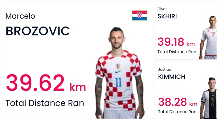 本届世界杯,布罗佐维奇踢了4场比赛,总跑动距离为56.26公里,其中小组赛3场跑动39.62公里,排名第1位;1/8决赛跑动16.64公里,刷新自己的纪录。4场比赛,布罗佐维奇跑动超过56公里,无愧世界杯头号铁人。