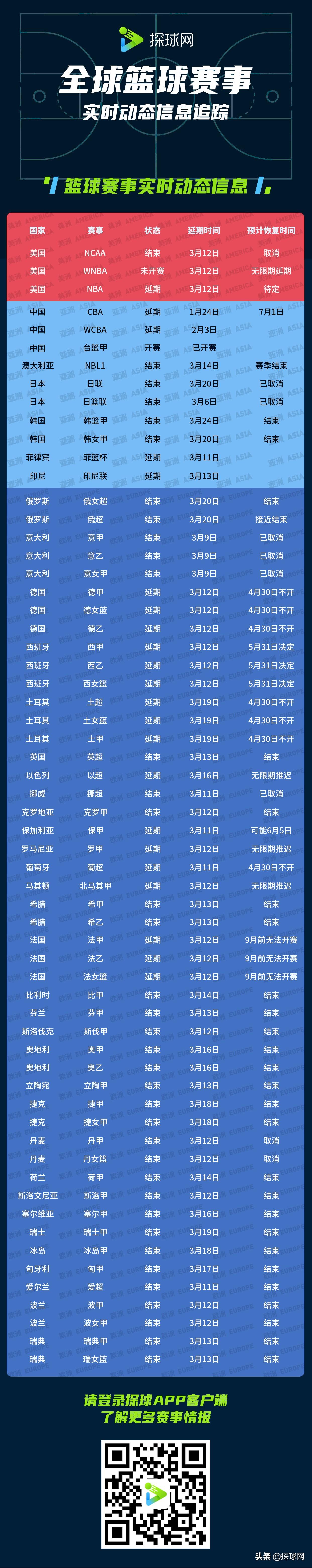 全球的所有的篮球联赛都暂停了比赛,全球一共9个大的篮球联赛,其中4个联赛延期比赛,有5个篮球联赛直接取消本赛季的比赛!其中NBA是最大的篮球联赛,然后就是CBA,西班牙篮球甲级联赛、WCBA、BIG3联赛、NCAA、NBA发展联盟、VTB联赛,荷兰篮球联赛,现在全部处于水深火热之中。