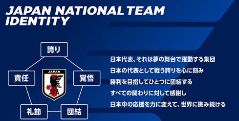 日本足球从业人员共同价值观的5个关键词分别是:骄傲、责任、礼节、团结、觉悟。日本国家队的5个宣言则分别是:日本队是在梦想舞台上跃动的团队,心中谨记作为日本国脚而战斗的骄傲,以获得胜利为目标而团结一心,对所有与日本队相关人士心怀感谢,将国内的支持化作能量继续挑战世界。
