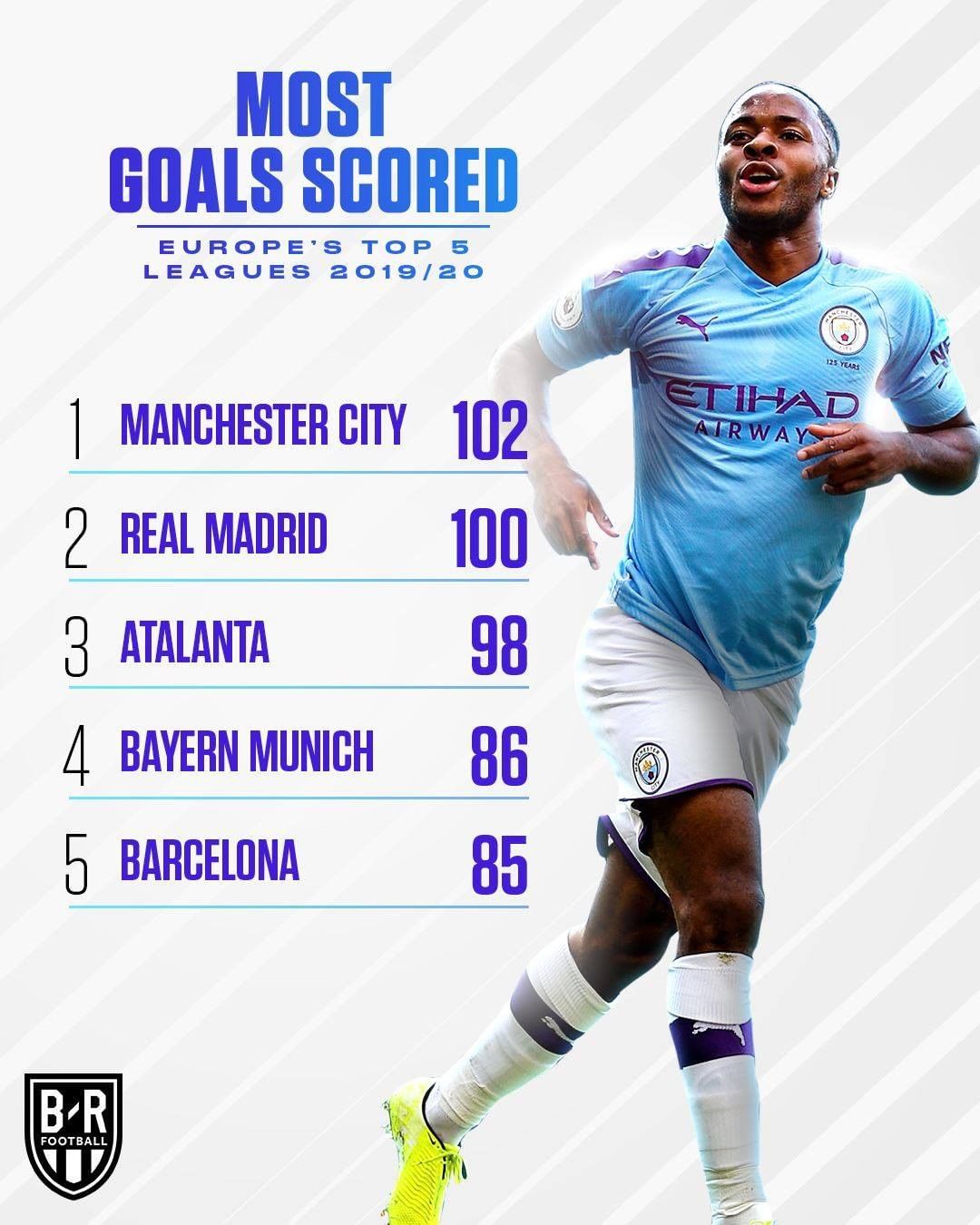 而在球队整体的进攻力上,称霸的依然是曼城,他们的102粒进球依然是欧洲五大联赛中最多的。排名2-5位的分别是100球的皇马、98球的亚特兰大、86球的拜仁和85球的巴塞罗那。