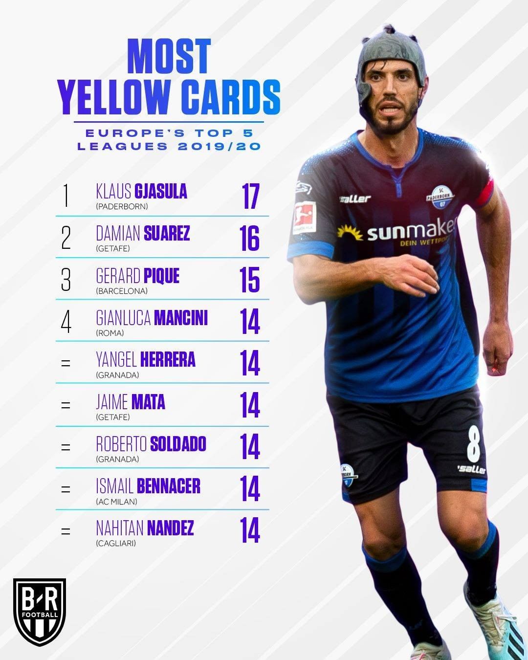 在吃牌榜上,本赛季从德甲降级的帕德博恩队中诞生了本季吃牌大王,贾苏拉一共吃到了17张黄牌。平均每两轮就要搞到一张黄宝石卡。而皮克本赛季吃牌也很多,他的15张黄牌排名第三位。