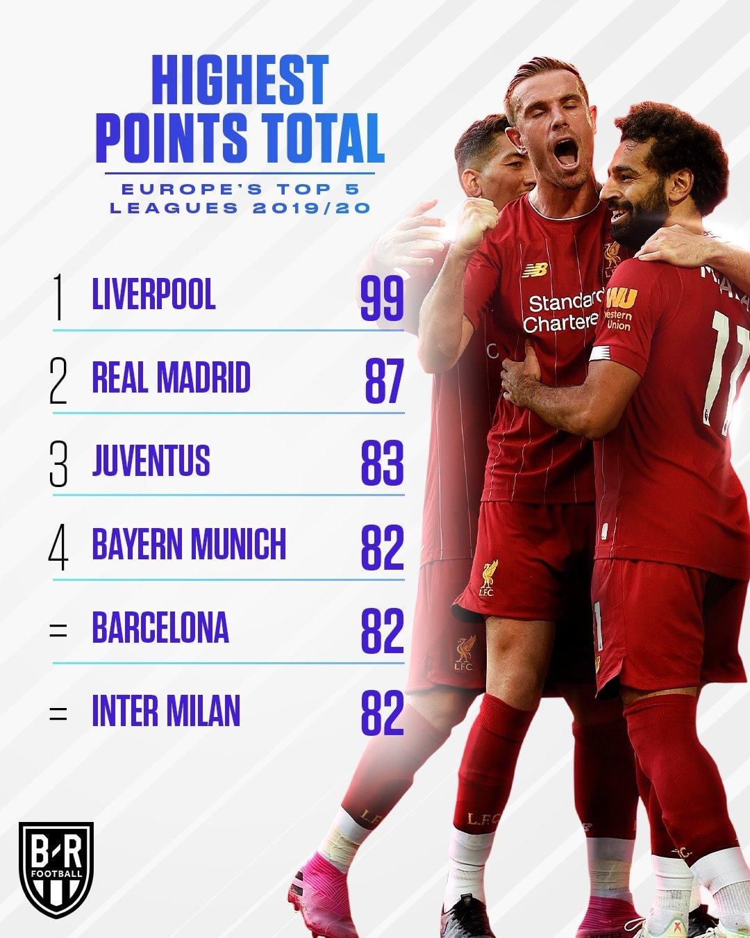 在联赛积分方面,本赛季利物浦虽然没有像曼城一样突破百分,但是99的高分足以让他们称雄欧洲五大联赛,西甲冠军皇马是87分,尤文为83分,拜仁是82分,巴萨和国米也都是82分。德甲只有18支参赛球队,所以相比其他几大联赛少4轮的比赛,积分也相对较低。