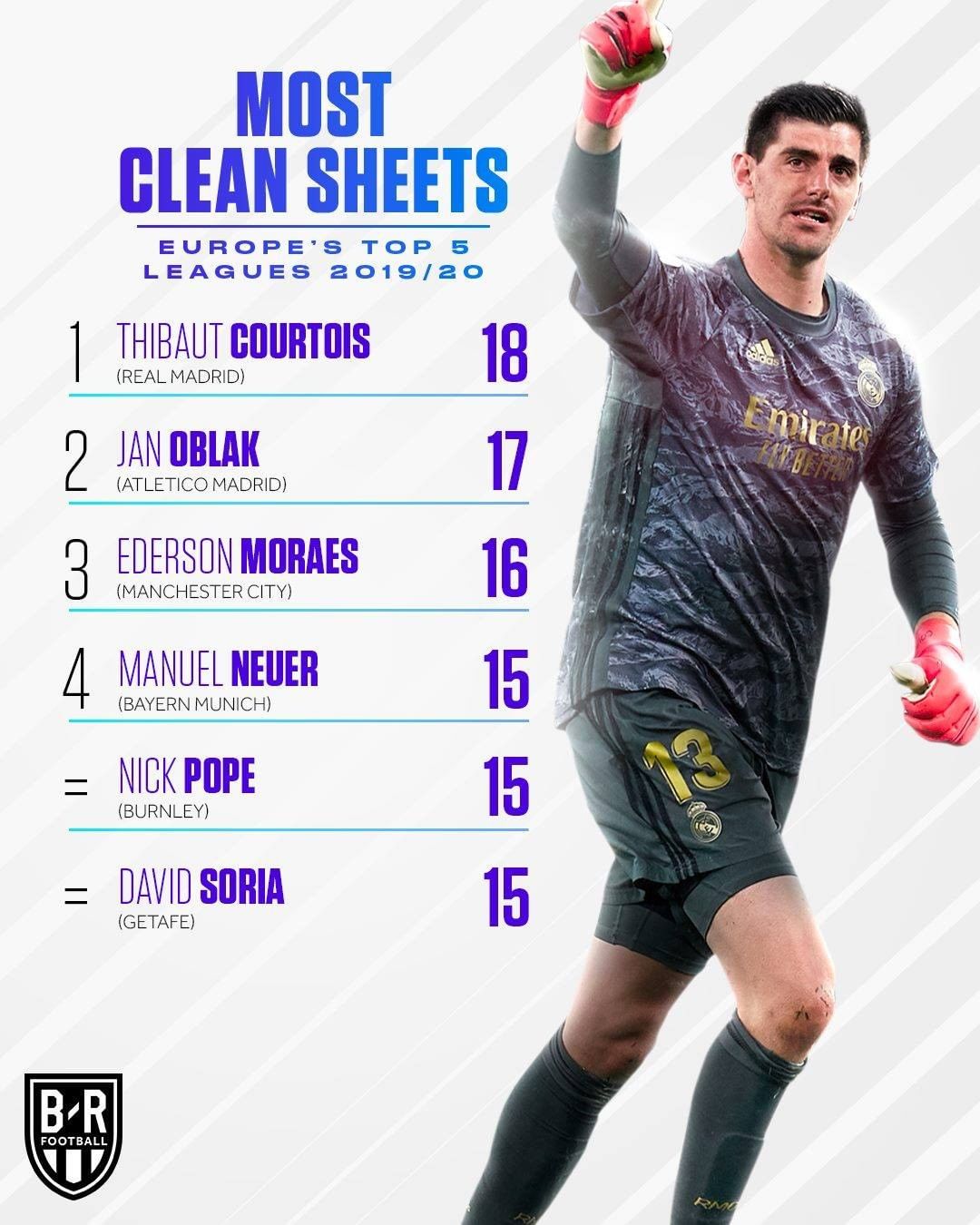 在门将的榜单上,皇马的夺冠功臣库尔图瓦的数据最为亮眼,他本赛季完成了18次零封,奥布拉克为17次。排在后面的还有埃德森的16次,诺伊尔、尼克-波普和索里亚的15次。