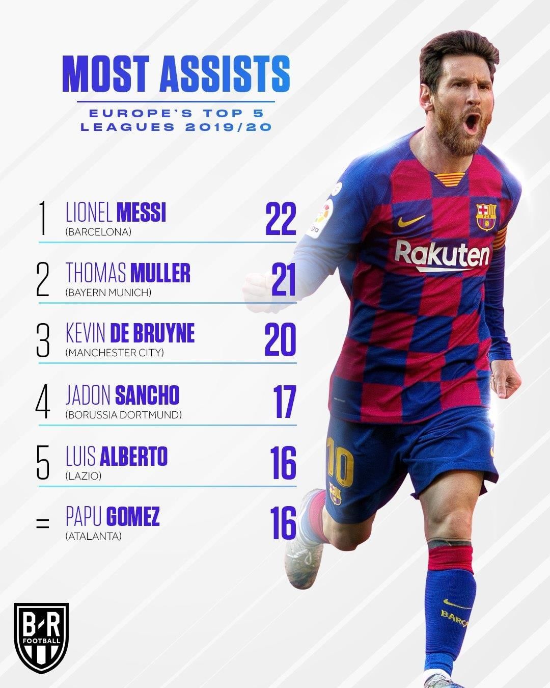 助攻榜上则是梅西的天下,他本赛季拿出了双20的表现,贡献了22次助攻,比第二名穆勒还要多1次。第三名是20次的德布劳内,之后是17次的桑乔和16次的阿尔贝托和戈麦斯。
