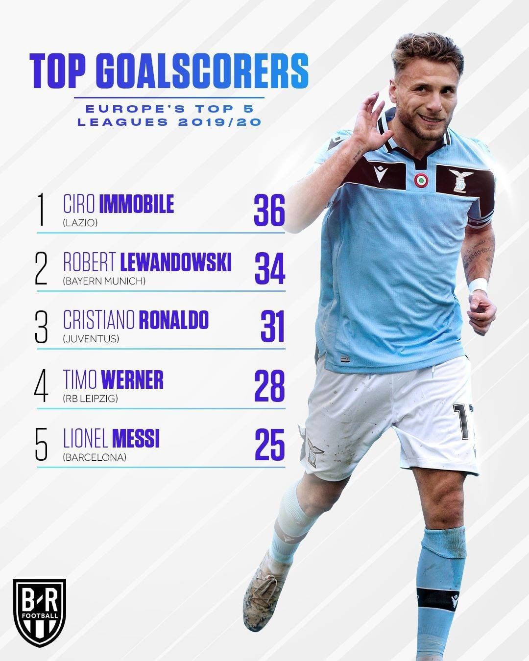 在射手方面,因莫比莱凭借36粒进球超越了莱万,成为了本赛季五大联赛的最佳射手,同时他也将欧洲金靴的荣誉收入囊中。排在后面的分别是34球的莱万,31球的C罗,28球的维尔纳和25球的梅西。