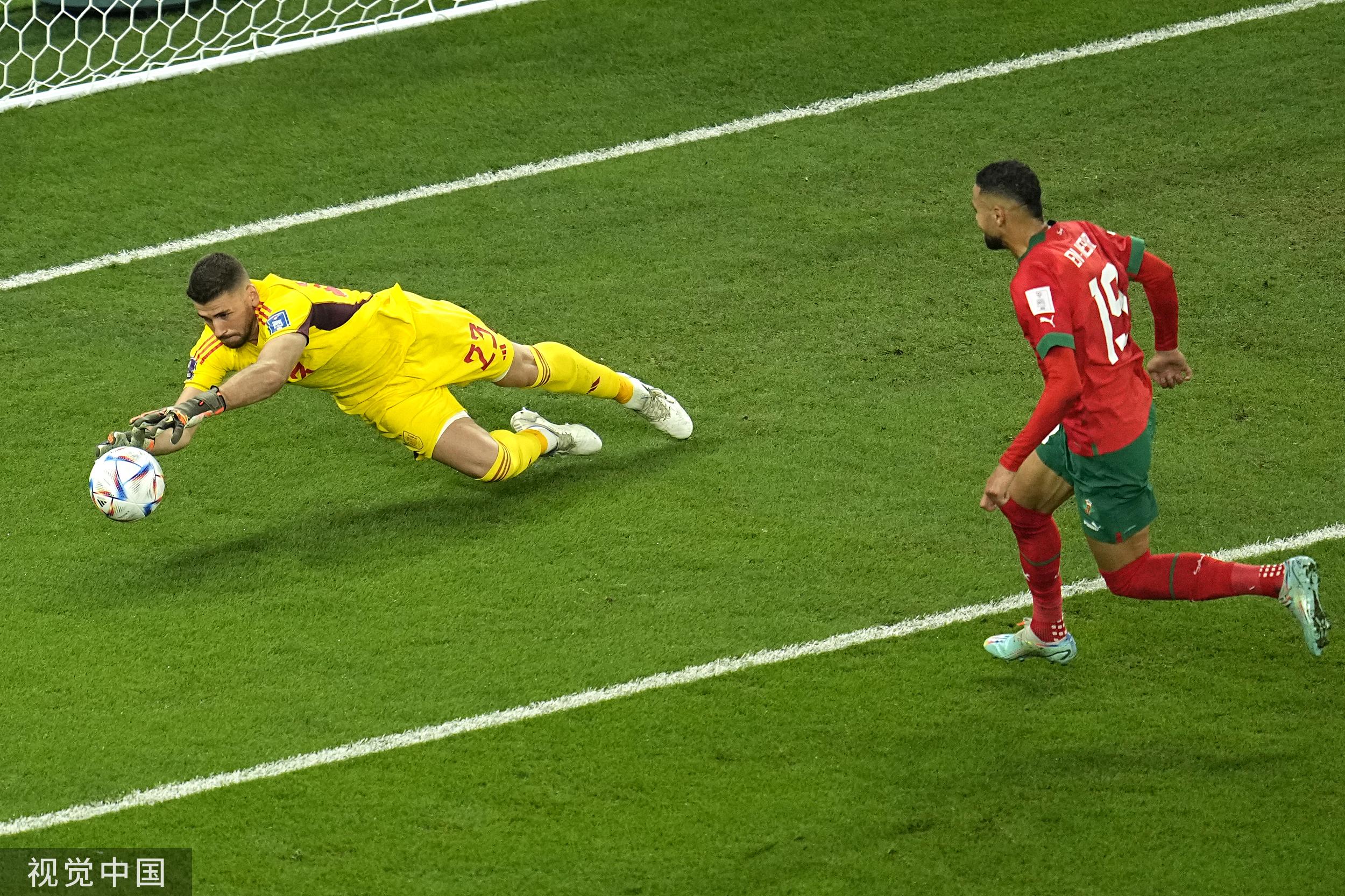 第81分钟,皮克禁区内手球裁判未做表示,只是给了摩洛哥球员一个角球。替补登场的19号恩-内斯里力压拉莫斯头球顶死角破门!摩洛哥2-1西班牙!