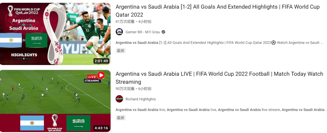 大量的“世界杯比赛视频”也随之诞生,这些视频封面往往是显眼的卡塔尔世界杯标志,以及某张现场截图,如果不仔细阅读标题最后出现的FIFA2022/2023或是eFootball,还有那莫名其妙的2到4小时转播时长,乍一眼看过去,实在很有迷惑性。