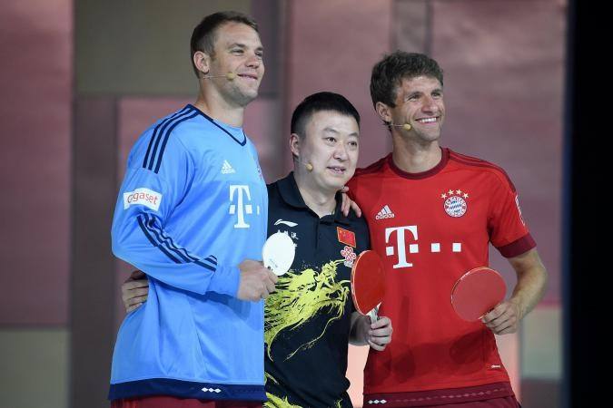 国乒运动员马琳和德国球星诺伊尔、穆勒参加《天下足球》的录制。/视觉中国