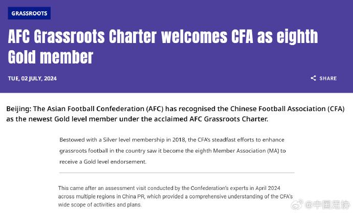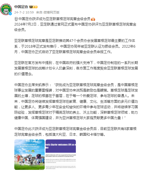 2024年7月2日,亚足联通过官网正式宣布中国足协获评为亚足联草根足球宪章金级会员。