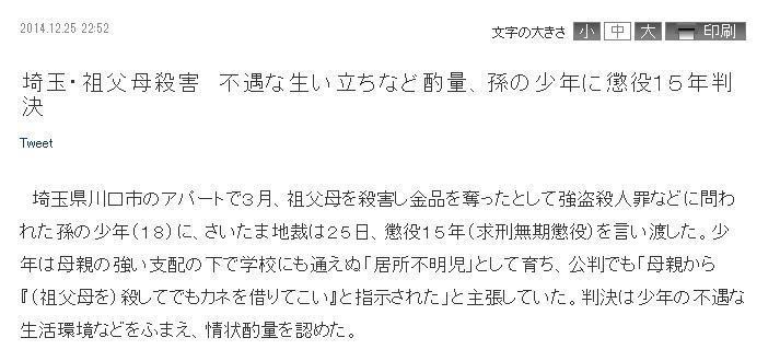 2014年,埼玉县川口市,一名17岁少年优希(化名)为贪图钱财持刀杀害了自己的祖父母。