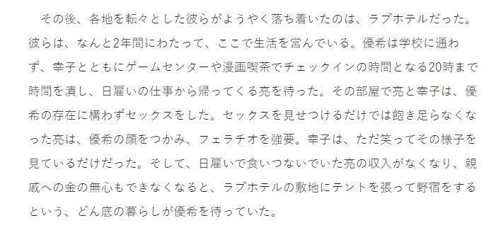 这样的生活对优希来说还不能算是地狱最底层,当亮临时工的工作收入没了,亲戚的钱也花完了之后,母亲还怀上了亮的孩子。