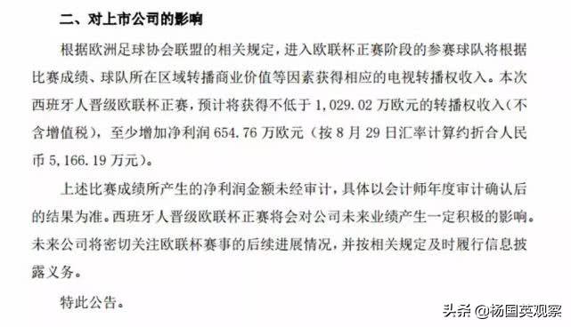 请注意下来自星辉娱乐的这样一条公告,西班牙人晋级欧联杯正赛,预计将获得不低于1029.02万元欧元的转播权收入,贡献净利不少于654.76万欧元,约合5166.19万元人民币。