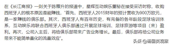 陈雁升的战略,在于投资思维上的“以小博大”,之前的陈雁升,是做足球周边起家的,而能从“周边”做到主流,算是“捞金”成功的第一步。西班牙人是个小品牌,但陈雁升以这样的小品牌为切入口,给自己苦心孤诣经营的泛娱乐产业加注乘数效应,这才是陈要达到的效果。