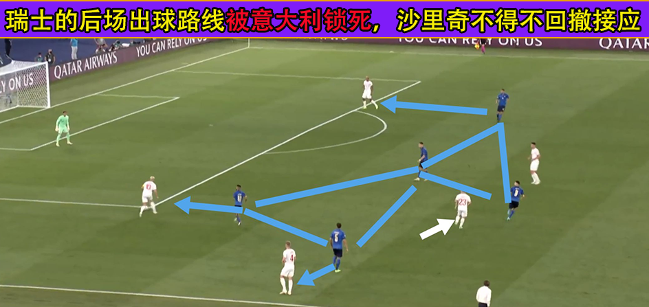 打意大利的时候,整个后场出球线路,完全被封死了,甚至让沙奇里和扎卡被迫要频繁回撤拿球,整个进攻节奏都被拖垮了。