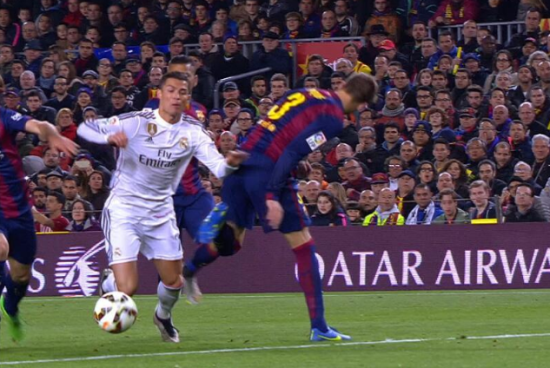 在突入禁区前皮克侧身伸出左腿假装要去绊倒C罗延误他的进攻节奏,C罗一看机会来了,想也不想便做出来跳水动作,这时皮克收回伸出去的左腿,C罗看着那条腿在眼前收回无奈已经无法挽回自己提前做好的跳水动作,倒在地上,只能说皮克当时做出动作时机把握十分到位,C罗假摔尴尬但并不影响向裁判示意是皮克绊倒自己,应该给他黄牌,结果也挺舒适,皇马这位球星因表演水平太差,侮辱裁判智商领到了黄牌,皮克也因为自己这次钓鱼执法成名。