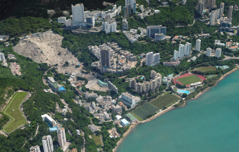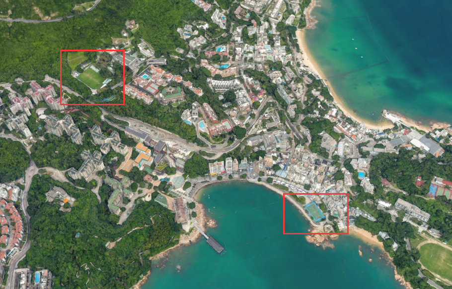 从赤柱上空看,业余足球场地还是有两座,靠近山坡的位置是标准场地,但是没有座位和灯光。