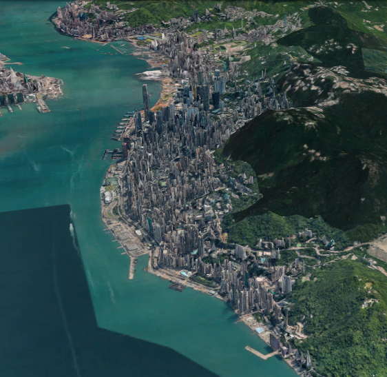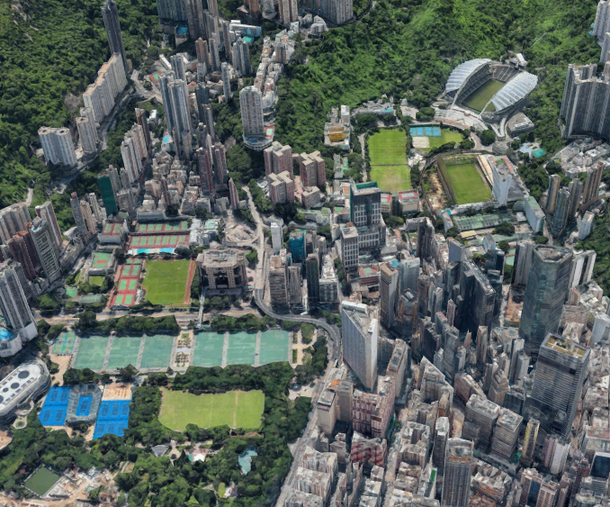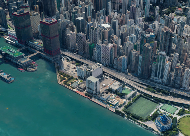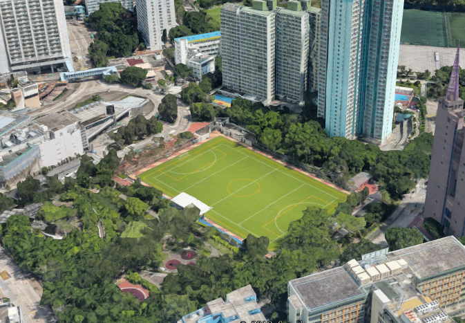 Google地球:上环的足球场,旁边两栋楼就是李嘉诚长实集团总部