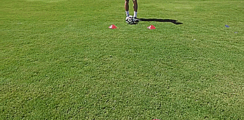 在实战中这不是一个简单的技能,但是真的非常酷,我们练习30秒,逐渐找到通过脚踝的摆动让球越过标志盘。