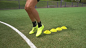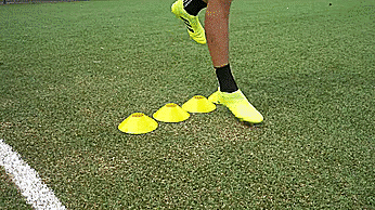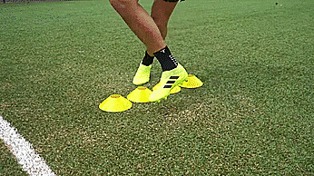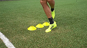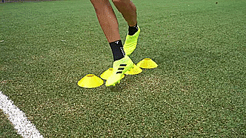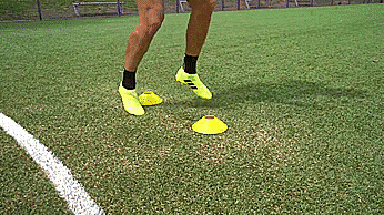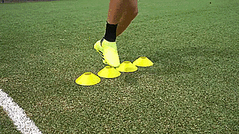 当带球朝向标志盘的时候,我们先迈一步看上去要向一个方向加速,然后用我们脚的脚外侧推球越过标志盘。