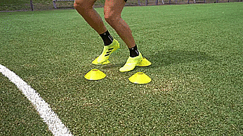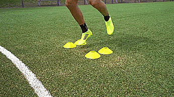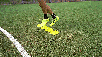 第六个是横向单脚跳,和上一个训练类似,这次我们侧对标志盘,然后横向来回跳过标志盘。