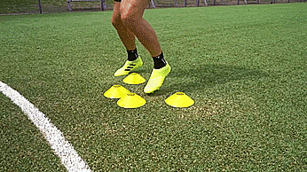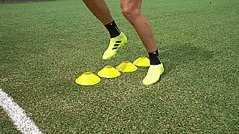 第二个是向前向后交替点地练习,我们将四个标志盘排成一排,我们从一侧开始,双脚交替点地到另一侧,再交替点地回到原来一侧。