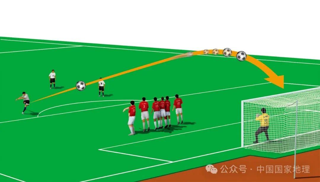 球员最开始踢球的时候会将弧线踢得比较高,此时加上球稍微向后侧方的旋转,球下端的空气压力变大,球会有些上飘——也就是坐电梯到6楼的感觉。