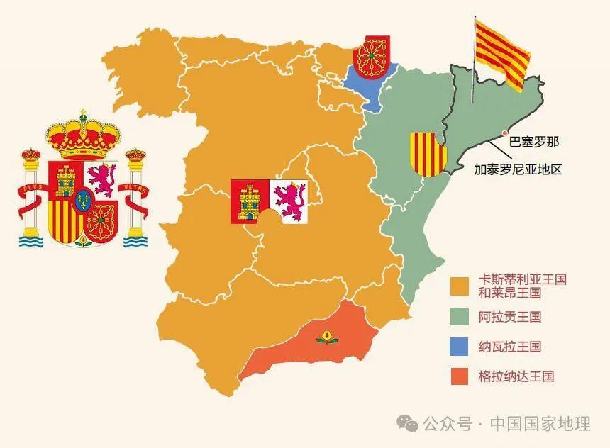 西班牙国旗上的盾徽图案,分别代表早期组成西班牙的五个王国:红底金城堡是卡斯蒂利亚王国,白底狮子是莱昂王国,垂直的红、黄条纹是阿拉贡王国,金色链网是纳瓦拉王国,最下方的石榴花则是格拉纳达王国。绘图/孟凡萌