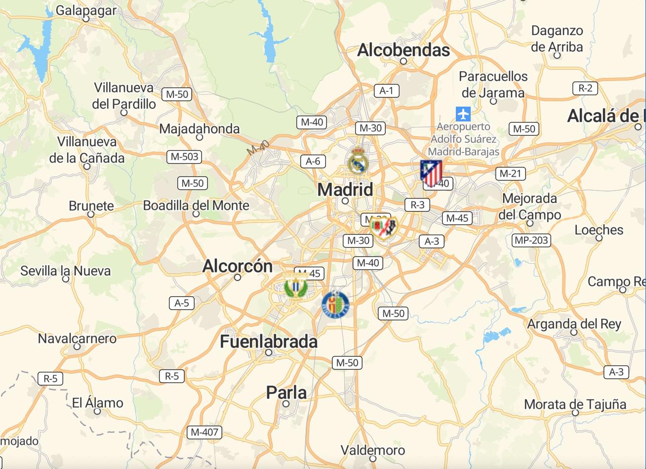 马德里自治区有五支西甲球队,除了皇马和马竞,还有巴列卡诺、莱加内斯和赫塔菲,其中巴列卡诺也在马德里市区。西乙没有马德里球队,西协甲的南区有阿尔科孔和富恩拉夫拉达位于马德里自治区。