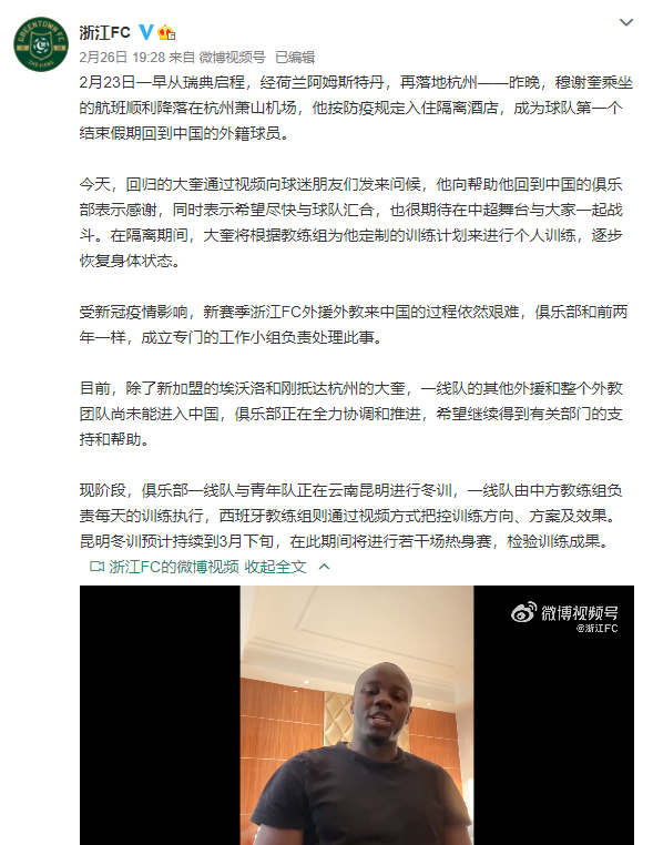 而相比弗兰克,穆谢奎则要更加幸运很多。抵达杭州后,他很快入住到隔离酒店。为了报喜,大奎还主动录制一段视频,“很高兴能够回来,也感谢俱乐部为我回到中国所做出的努力。我现在正在隔离中,执行教练组安排的训练计划,我也希望尽快与球队会合,与大家见面,我也迫不及待地想要代表球队在新赛季中超舞台上战斗,听到你们在看台上嘹亮的歌声。”