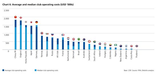 世界各国女足俱乐部运营支出平均数和中位数