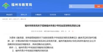 台海网3月6日讯 据福州市教育局发布 近日,福州市教育局发布《福州市青少年校园足球教练员招聘办法》,计划在2020年面向社会公开选聘20名校园足球教练员。